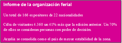 «Ha sido nuestra primera experiencia en Argelia y ha resultado interesante, de ella esperamos sacar conclusiones útiles para el futuro. Sin embargo la feria están más orientada a fabricantes de maquinaria y materia prima que ha transformadores siendo la razón principal la política arancelaria y de subvenciones del gobierno argelino. A pesar de ello queremos destacar la buena organización por parte de AVEP»