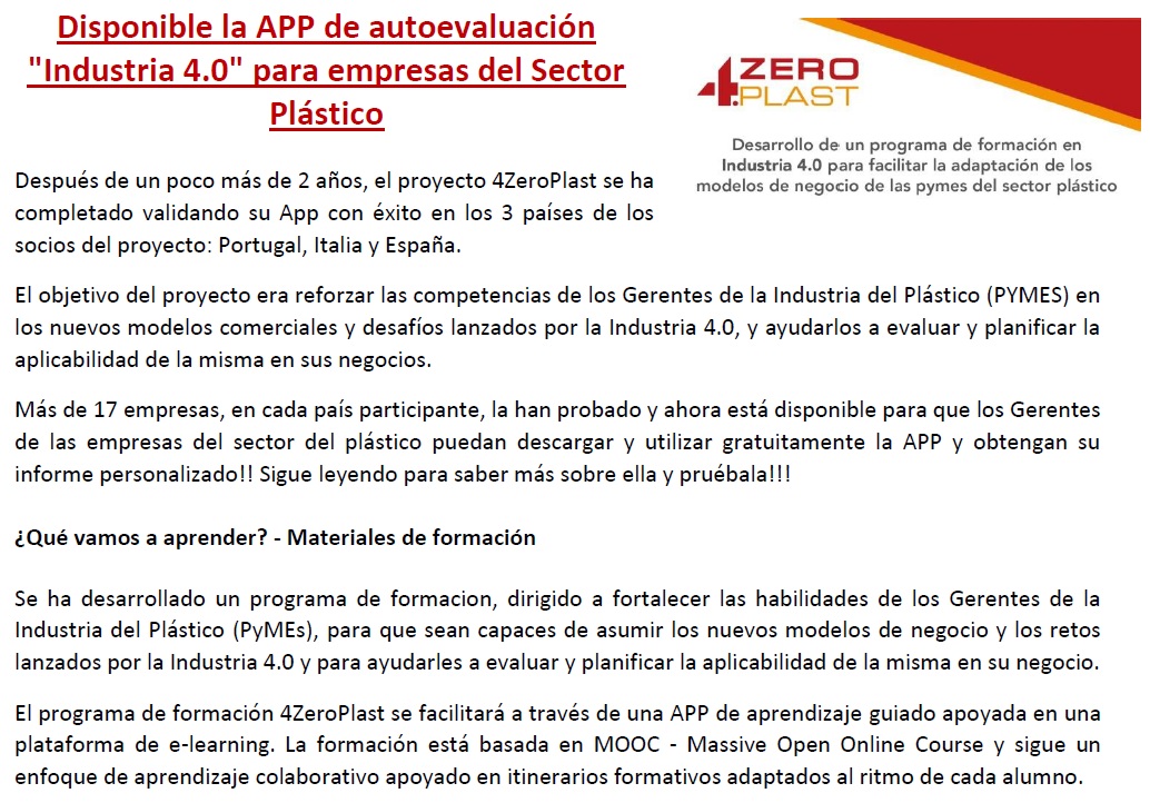 Disponible la APP de autoevaluación «Industria 4.0» para empresas del Sector Plástico https://play.google.com/store/apps/details?id=com.nunsys.a4zeroplast https://apps.apple.com/es/app/4zeroplast/id1532713765